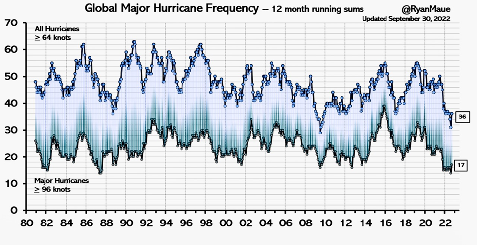 The 2022 Atlantic Hurricane season ended with only 78% of the average ACE recorded compared to its 30-year climatology average ACE during the 1991-2020 period. The 2022 ACE level is 60% lower than occurred during the six-year period inclusive of 2016 through 2021 despite climate alarmism hyped propaganda the the world is experiencing a “climate emergency.”