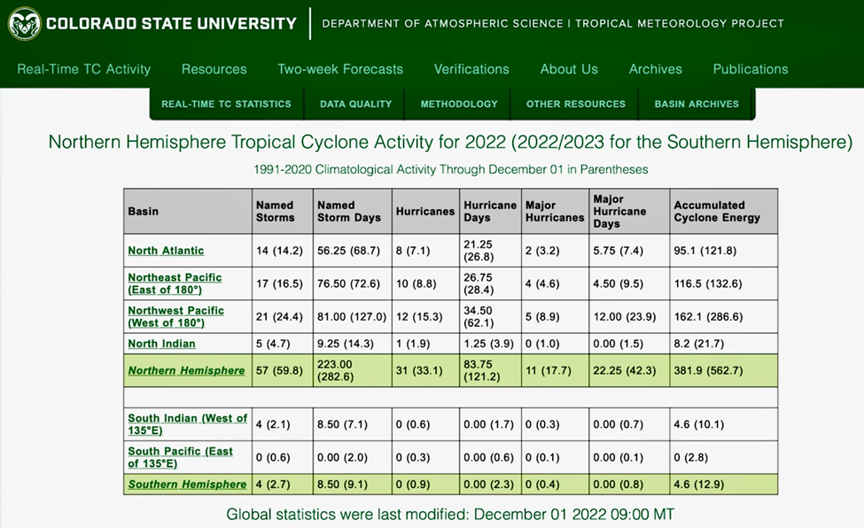 Colorado State University’s Department of Atmospheric Science/Tropical Meteorology Project has compiled the year 2022 tropical storm data (shown below) establishing that compared to its 30 year North Atlantic data records covering the Climatological period 1991-2020 the year 2022 hurricane season was below average in Named Storms, Named Storm Days, Hurricane Days, Major Hurricanes, Major Hurricane Days and Accumulated Cyclone Energy (ACE).