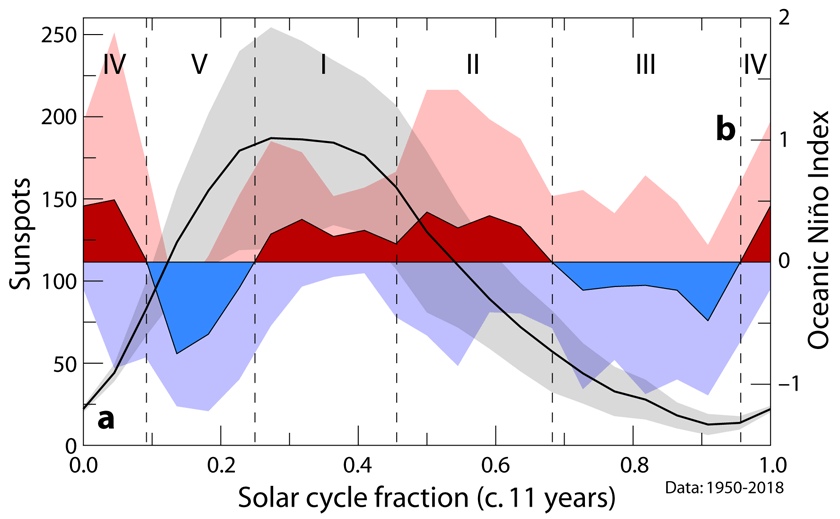 This figure from my book explains the relationship between ENSO and the solar cycle. We are about to finish phase V, increasing solar activity Niña-frequent, and should enter phase I, high solar activity Niño-frequent, before moving to the highly variable phase II.