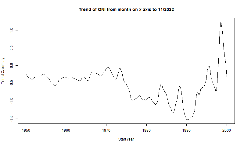 Figures 2a and 2b present the unsmoothed monthly Oceanic Nino Index (ONI) data (data here), with 2a starting in January 1979 and 2b with the data starting in January 1970. With the 1979 start (Figure 2a), there is a noticeable trend from positive values to negative, but with the 1970 start (Figure 2b) the trend line flattens greatly.