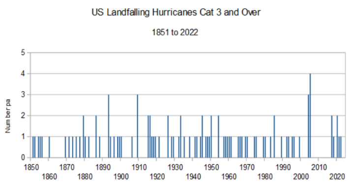 Not a single US hurricane landfall for some 11 years followed that “spike.”