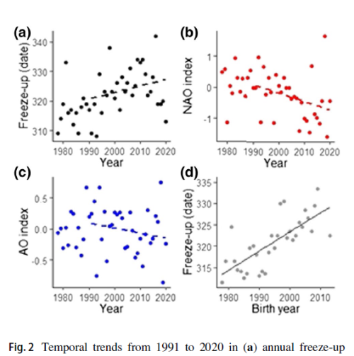 It confirms a statement I made last month, that between 2016 and 2021 “there has been only one ‘late’ freeze-up year (2016)–but five very early ones.” Of course, 2021 was not included in this new dataset, so that would be “four very early ones” up to 2020.