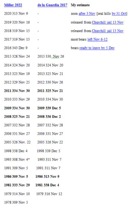 In the lists below, the first number is the year, the second number is the Julian day of the year (e.g. 313), and the third is the calendar date of the corresponding Julian day from the Miller paper vs. the de al Guardia paper. For the last five years, I’ve added my own assessment made at the time, and because this is a screencap, here are the links for my estimates: for 2020 (when bears were killing seals on offshore sea ice by 31 Oct), 2019, 2018, 2017, 2016. I didn’t transcribe all of the pre-2005 dates, only a select few.