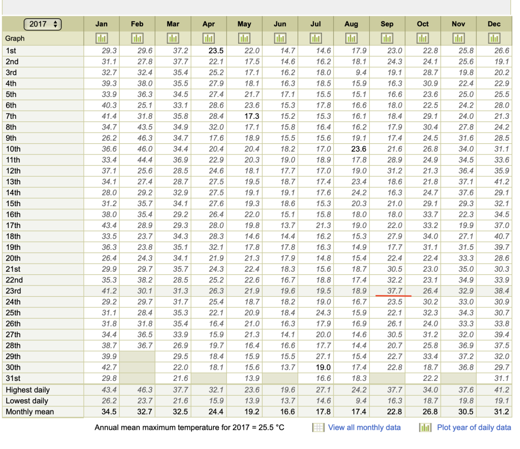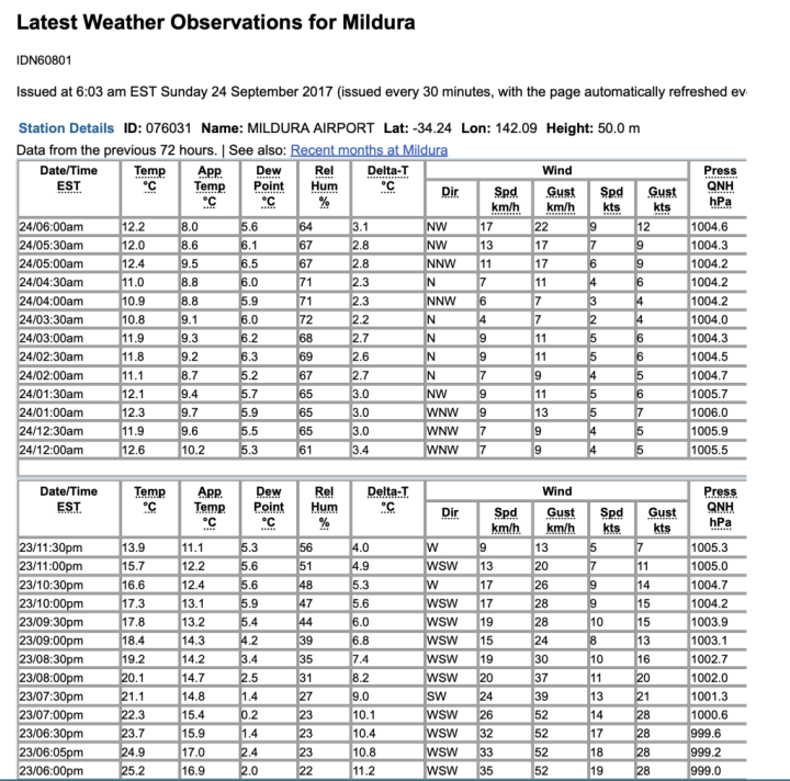 For example, for the 23rd September 2017, the highest value for that day as shown on the observations page for Mildura was 37.2 °C, recorded at 12:00pm.