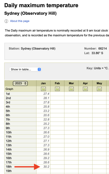I went online to the Bureau’s data archive to see the maximum temperature officially record for this weather station for 18th January 2023. At 9 am this morning, a different value was entered, the value of 30.2°C, giving a discrepancy of 0.1.