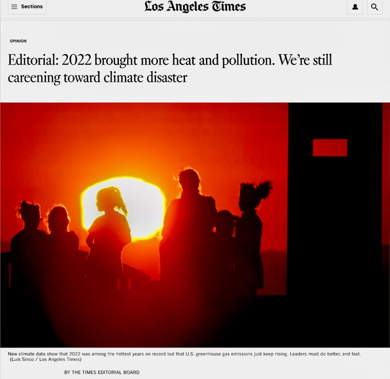 The L A Times published an Editorial shown below that falsely represented the year 2022 climate outcomes based on their articles science data unsupported climate alarmist propaganda claim that the world is heading toward a climate disaster.