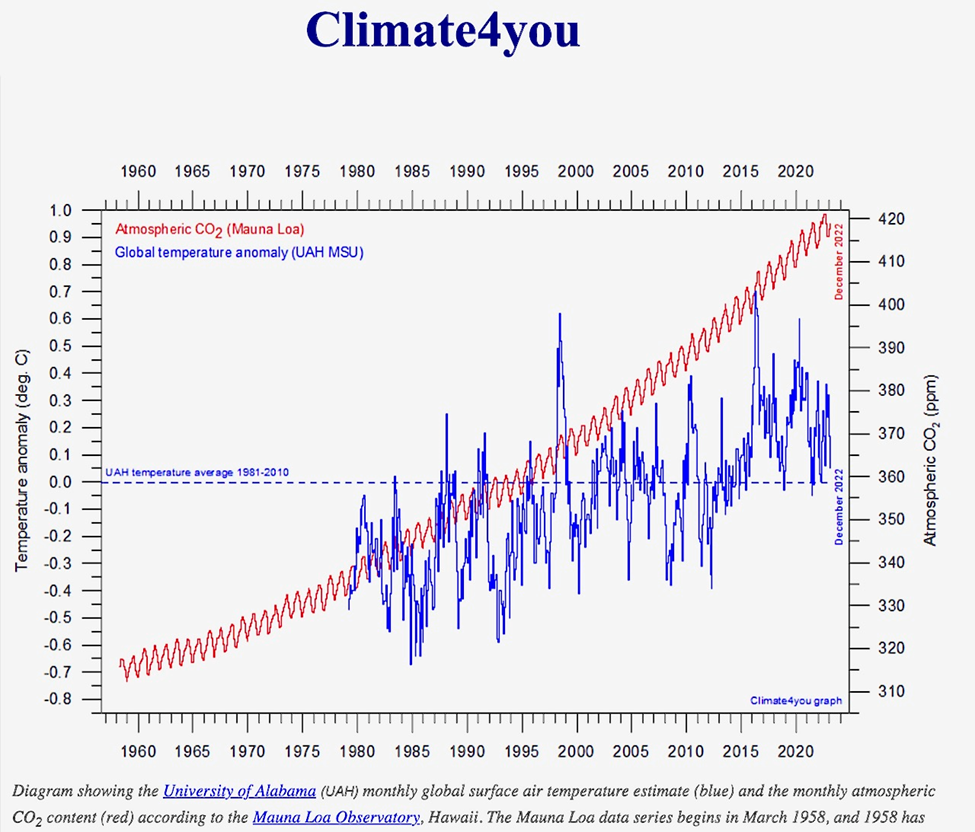 The UAH satellite measured climate global average temperature anomaly data shown below with measurements from year 1979 more clearly displays the disconnect between the upward climbing global atmospheric CO2 levels and the measured global average temperature anomaly science data which has a declining trend for the period between 2016 and 2022 of -2.2 degrees C per century. Again, the L A Times conceals from the public measured climate science data which is contrary to its contrived climate alarmist propaganda agenda.
