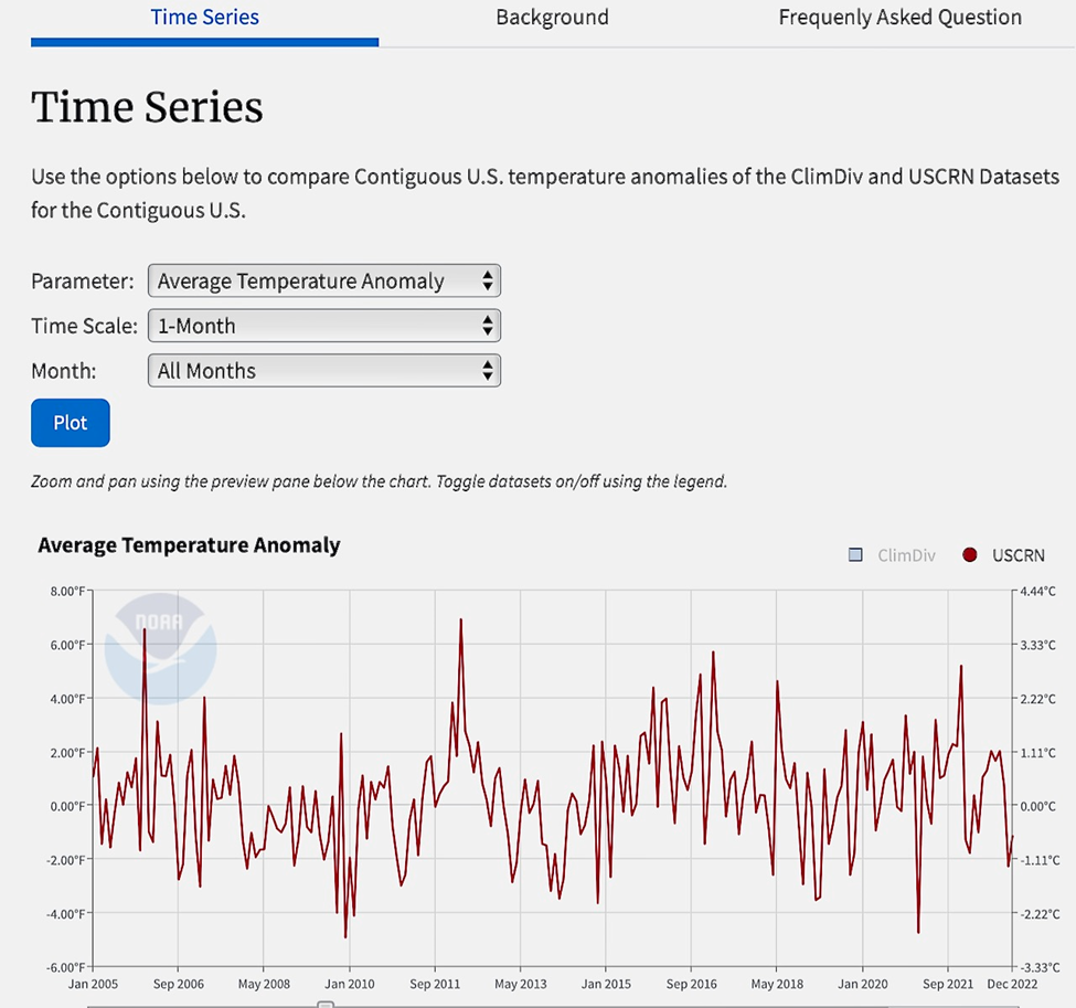 NOAA also has measured average temperature anomaly data for the contiguous U.S. from its USCRN network of specially sited temperature measurement stations (stations that meet NOAA standards for siting to preclude spurious heat sources from impacting measured data) that represent the most accurate U.S. temperature anomaly measurement system data that went into operation in 2005. This U.S. average temperature anomaly data is shown below which shows the contiguous U.S. is not experiencing increasing temperature anomaly trend outcomes during this period as hyped in the L A Times editorial.