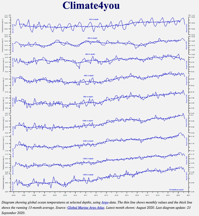The most accurate and complete measurement for Ocean depths temperature data is obtained by use of the fleet of robotic instruments that drift with the ocean currents and move up and down between the surface and mid-water level that began operation about the year 2000. This system called the Argo system measures data over the ocean depths from about 1900 meters depth to the top 100 meters with that data at various depths shown below (under the Oceans section heading) from about year 2004.