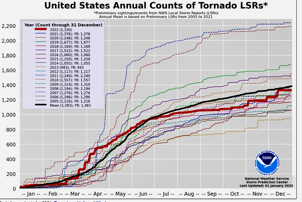 The Times editorial also failed to address the below average occurrence of U.S. tornadoes during year 2022 as shown below from NOAA’s website which also shows that during the 18 year period displayed 13 of the years were below average with only two outlier above average years that occurred 12 to 15 years ago.