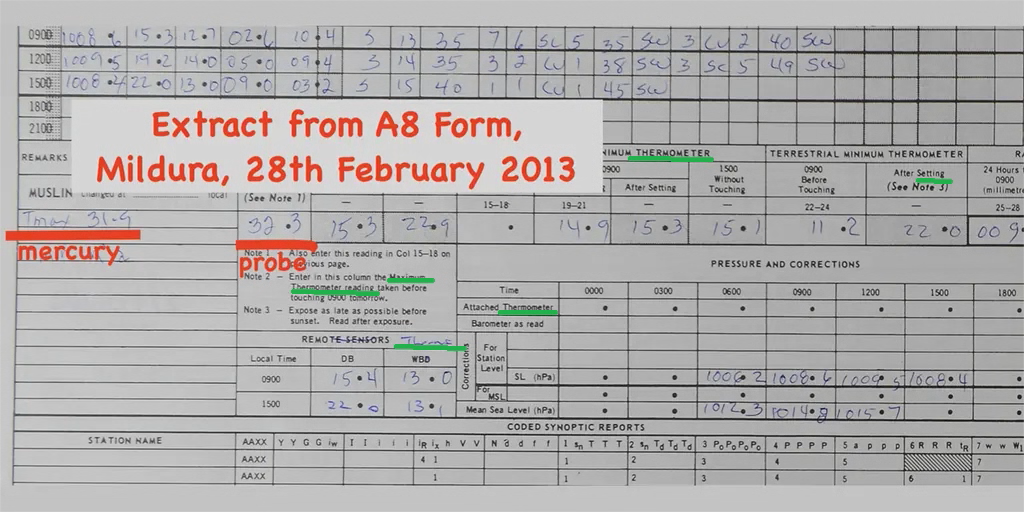 There is still time for the current director of the Bureau, Andrew Johnston, to help me work out the extent of the problem by making all the parallel data public. But so far, he won’t even met with me; all-the-while emailing that the bureau’s purpose designed probes are equivalent to the old mercury thermometers making numerical averaging unnecessary. Except the limited data that I have obtained, transcribed and analysed for Mildura tells a completely different story. A story of incompetence, as much as malfeasance.