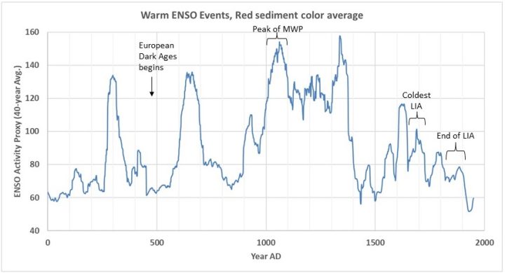 Figure 2 shows that frequent strong El Niños occurred as the world entered the Little Ice Age, they signal eventual global cooling. El Niños became quite rare as the Little Ice Age ended. We’ve had two very strong El Niños only 18 years apart, are they a sign of cooling ahead?