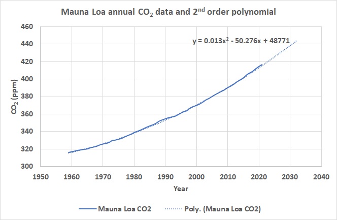 In order to get the best and most precise fit, convert the years to smaller numbers, by subtracting initial year-1. The fit is very good and probably quite predictive, but remember the CO2 concentration is highly autocorrelated, which means each year’s value is highly dependent upon the previous year’s value. Thus, the R^2 value, which assumes each observation is independent of the others is not appropriate here and will be inflated to reality. My spreadsheet is here, I did not correct the statistics for autocorrelation, as I didn’t need that to project the values to 2032. https://andymaypetrophysicist.com/wp-content/uploads/2023/01/Mauna-Loa-CO2_2nd-order-fit.xlsx