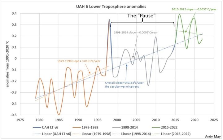 I see nothing wrong with your crystal ball, but one can actually make the argument that the forcing of carbon dioxide could be having a greater impact now than in the past even when looking at UAH. 2022 was the 7th warmest year despite a La Niña. This goes for 2018, 2020 and 2021 as well. What would your counter argument be? I’m asking just because I’m just curious. Javier Vinos had an interesting explanation for it if I recall but I forgot what it was.
