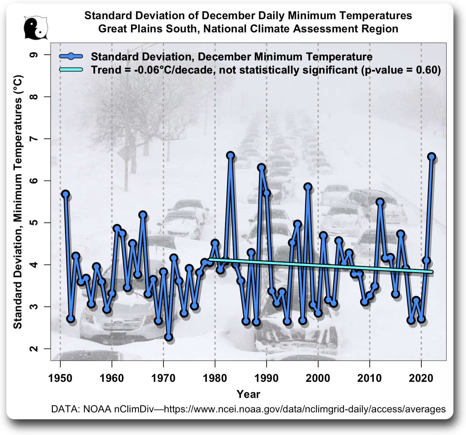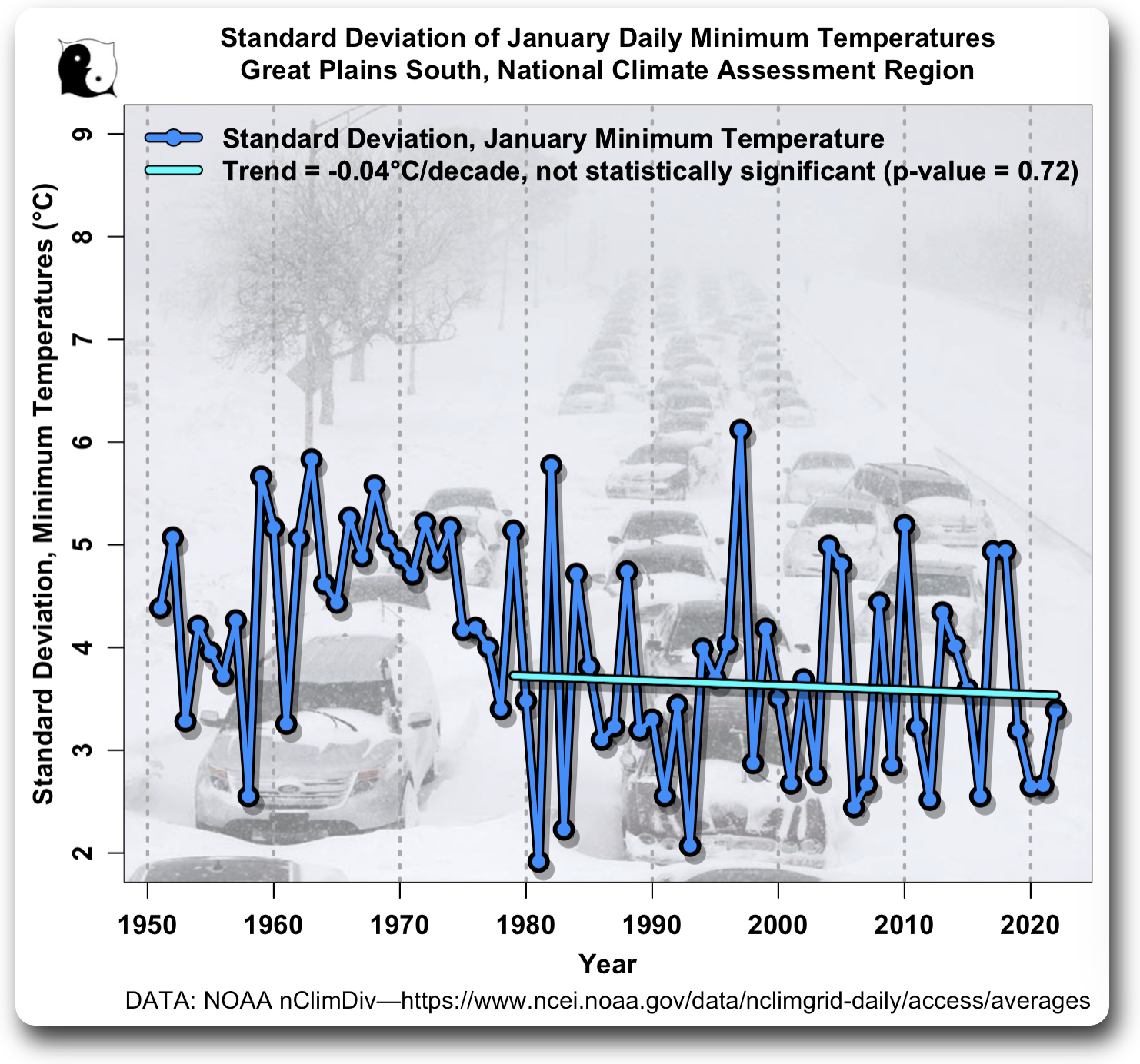 The currency of statistical methods is providing the maths to show how your proposed statistic, the standard deviation, quantifies the expected frequency of extreme events (e.g.”cold snaps”). So what’s lacking? 2. The definition of an estimator, as a function of the above statistic, of the expected frequency of the extreme event for the month of February and how the sample estimates as realisations of this estimator trend across years. Note its not the trend in standard deviations that is important because that’s not the inference you are interested in, its the trend in the above estimator of the expected number of extreme events (i.e. cold snaps) in this particular month. If you can give such an estimator is it unbiased, consistent and minimum variance compared to alternative estimators?