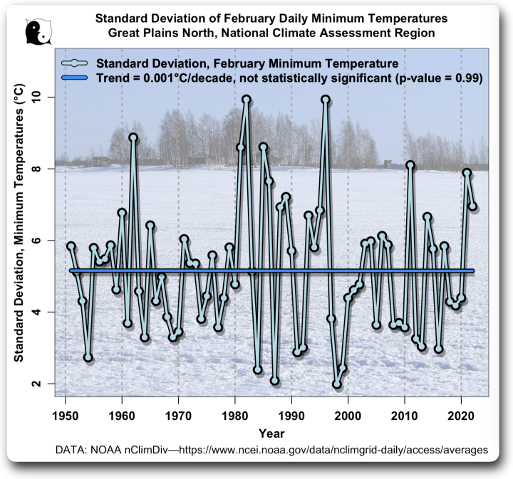 “Next, I didn’t answer because I calculated standard deviations in the normal way. I took all the February days for a given year and took their standard deviation.” If your source data only has regional daily means (i.e. means across stations) then you should dig deeper since those means are not fit for purpose (to give valid unbiased means and standard deviations) if they involve, as is certainly the case, non-random within-station missing values and non-random drop-in and drop-out stations. This point you failed to acknowledge and it is important since different sets of stations contributing to different time points can inflate the variance and thus your sample standard deviation as an artefact of the sampling imbalance (technically, station random effects do not cancel out in unbalanced datasets like they do in balanced spatio-temporal datasets so marginally they contribute to the temporal variances and that process needs to be modelled).