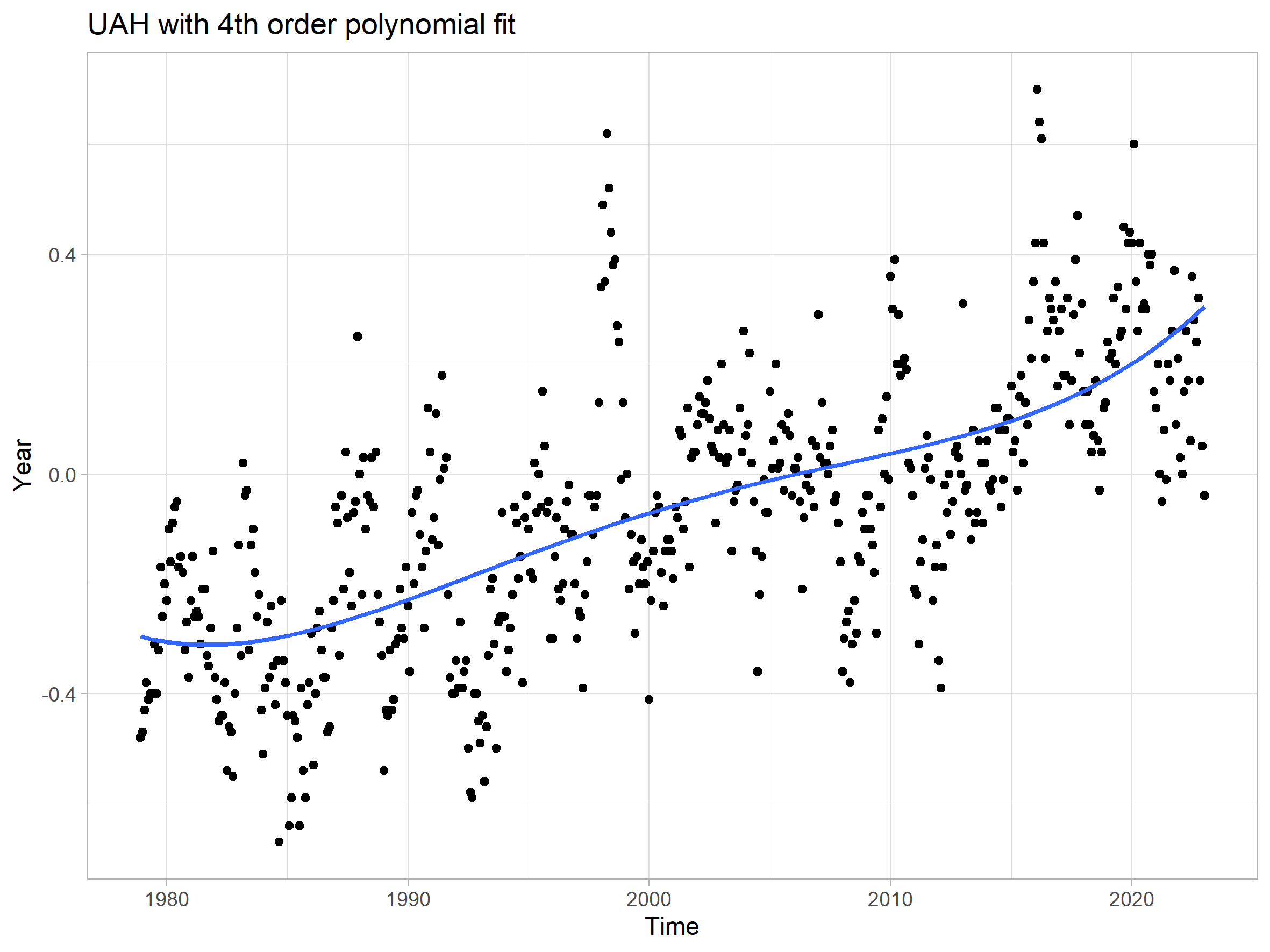 Linear warming trend since that first -0.04C anomaly (April 1983) is +0.14C per decade, according to UAH.