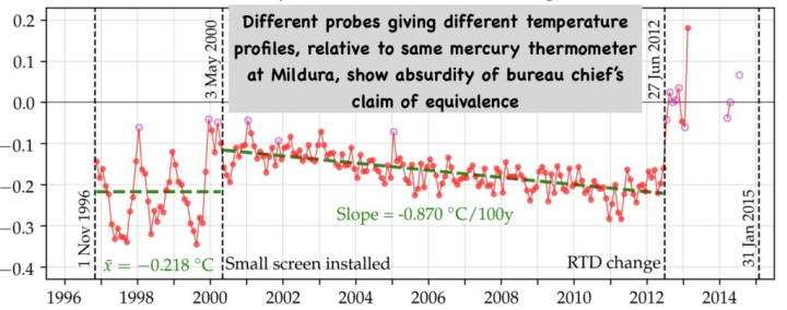 Initially the temperatures as recorded at Mildura, from 3 May 2000 from what I am assuming was a new second probe in the new shelter, were more consistent with the measurements from the mercury thermometer. But then I could see from the data that the temperatures from the probe started to cool relative to the mercury thermometer for the period to 27 June 2012. Cooling was at a rate of nearly 1°C per 100 years.