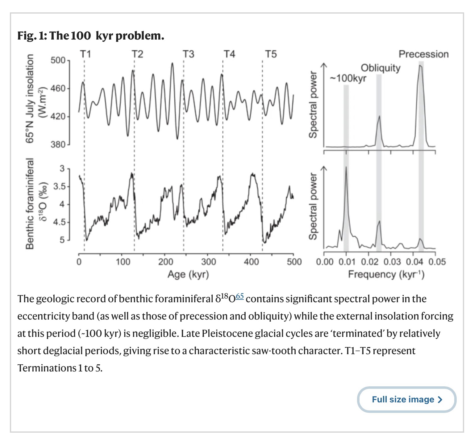 Here’s a spectral power analysis of benthic forams d18O over the past 500,000 years. The dominant periodicity is Eccentricity followed by Obliquity.