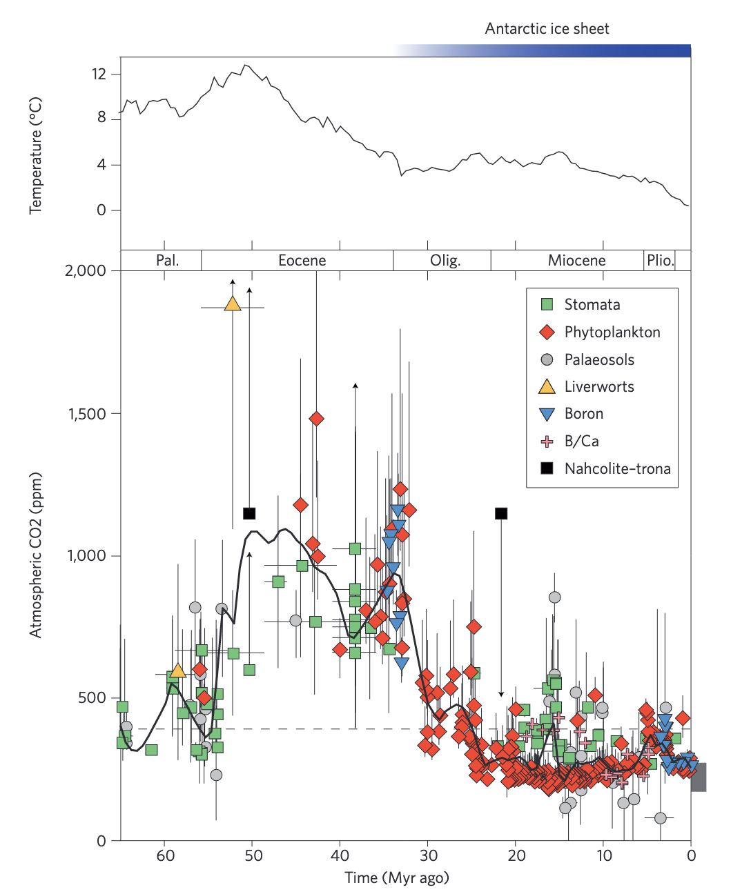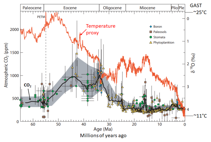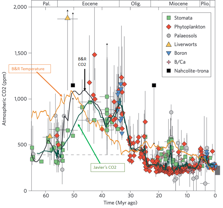 Javier’s graphic makes this very clear for the past 70 million years. Earth’s temperatures and atmospheric CO₂ levels higher than 3000 ppm.
