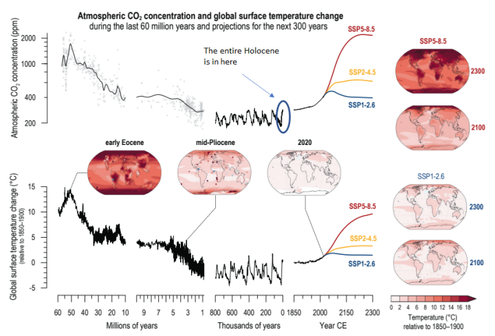 The circled area in Figure 1 shows the CO2 concentration increasing during the Holocene, as temperatures rise about five degrees from the last glacial maximum. This crams the entire Holocene into less than a millimeter. AR6 tells us that the “intent of [Figure 1] is to show that CO2 and temperature covary, both in the past and into the future…” But the truth of the relationship between them is cleverly hidden in Figure 1 by the design of the figure, the weird time scale, and the choice of the data used. It is not a scientific illustration meant to illuminate the truth; it is a clever bit of propaganda.