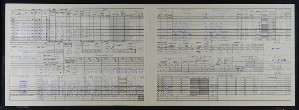 The feature image is a scanned A8 Form from 13th September 1996. This is the last September that the mercury was the official recording instrument at Mildura, from 1 November 1996 there was a change to the probe. An unusually cold 14.3C was recorded from the mercury as the maximum at 9am that morning, this being the maximum for the day before. Those interested in chasing down such things will see that this is also the maximum temperature recorded in the ADAM data archive for meteorology for 12th September 1996. Interesting the ACORN-SAT data base, used by the Bureau to understand climate variability and change, shows 15.1C for that day. To be clear, through remodelling alone the Bureau has changed this maximum daily value by 0.8C. Such dramatic changes via remodelling, also known as homogenisation, are not unusual.