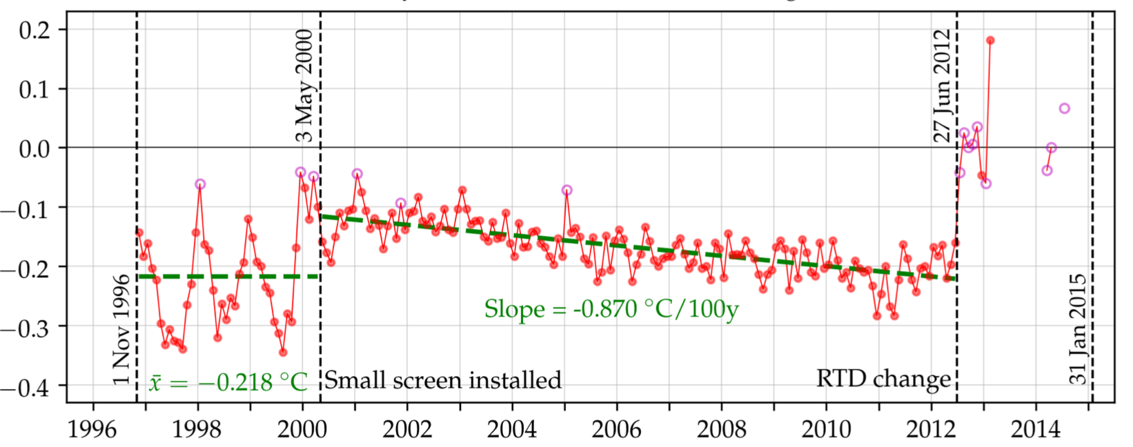 I wrote to Sophie Lewis and others at the time suggesting it might be more about equipment change than AGW.