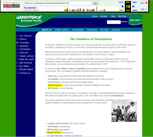 As Greenpeace was founded in Canada in 1971 and Dr Moore is Canadian and was involved in the earliest activities then there’s little doubt in my mind that, at the very least, he’s a founding member of Greenpeace. Even Wikipedia says he was a past President of Greenpeace