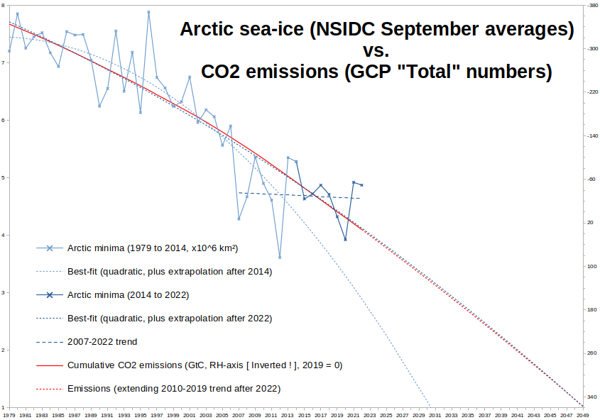 Note that I can “tweak” my “Cumulative CO2 Emissions” curve to get a (very) good match to the quadratic best-fit curve for the 1979 to 2022 NSIDC dataset.