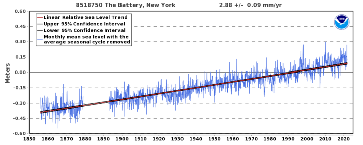 The mean sea level (MSL) trend at The Battery, NY, USA is +2.90 mm/year with a 95% confidence interval of ±0.08 mm/year, based on monthly mean sea level data from 1856/1 to 2022/10. That is equivalent to a change of 0.95 feet in 100 years. (R‑squared = 0.838)