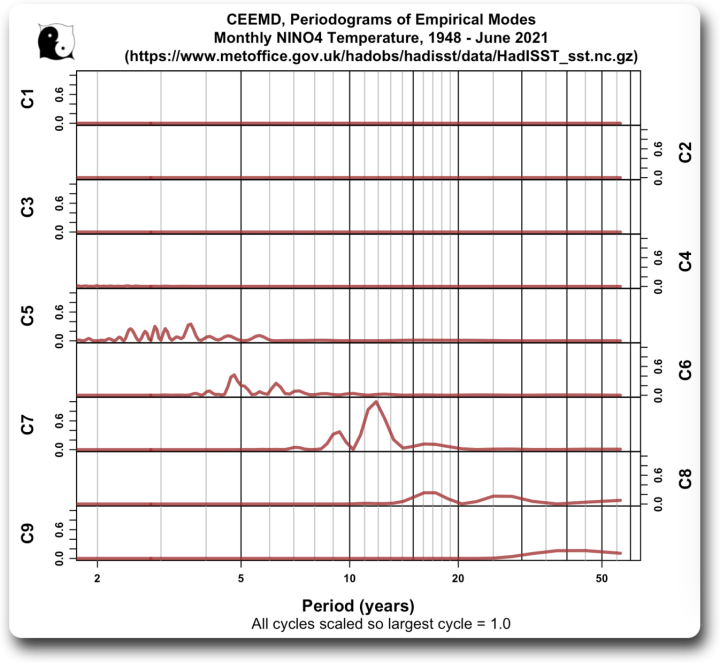Here, we see that empirical mode C6 contains a strong sunspot cycle peaking at just under 11 years, with a bit more sunspot-related strength in empirical mode C7. Other than that, there’s little to be seen.