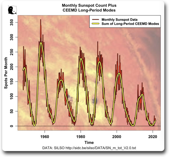 2: Repeat Fourier spectral analysis and CEEMD for each hemisphere of the sun’s sunspot number, and repeat again for both options for alternating from one hemisphere to the other at solar minimum to consider only the solar hemisphere that has one of the two main solar hemisphere magnetic polarities. I admit this is “P hacking” cherrypicking, but if an extreme P value (around .001?) for correlation with Nino 4 temperature (or some other weather record, preferably for a large area at least as large as Nino 4) can be found, then I think it’s worth exploring if P value much below .05 is repeatable and looking mostly reliable over multiple different time periods.