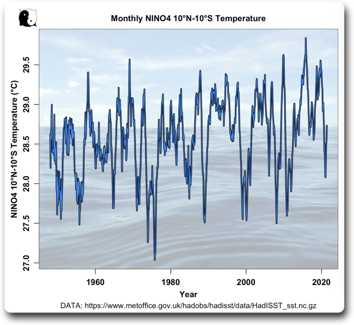 Figure 5. Monthly NINO4 10°N-10°S temperatures, January 1948 — June 2021.