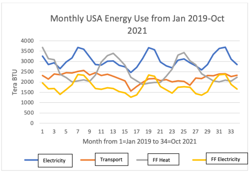 The data in Figure 1 give an indication of the energy used over the months from January 2019 to October 2021 for transport, all heat and electricity (in total and the fossil fuel contribution in the USA. I have derived this diagram from the US Energy Information Agency data[i].