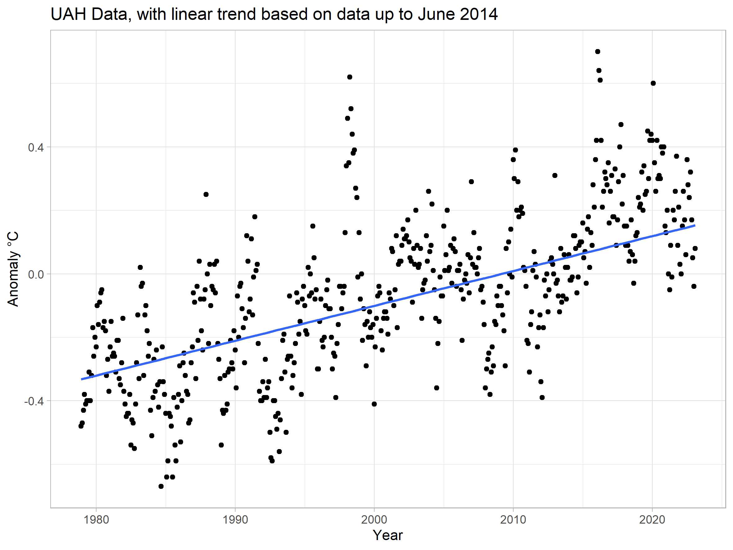2015 to 2023 SO2 emissions falling, but the temperature trend was flat, not warming, as would be expected from fewer SO2 emissions.