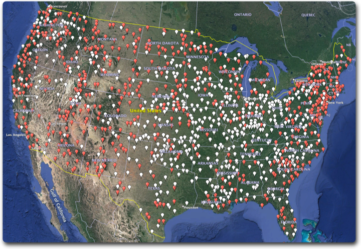 Figure 5. USHCN maximum temperature trends by station. White is cooling, red is warming.