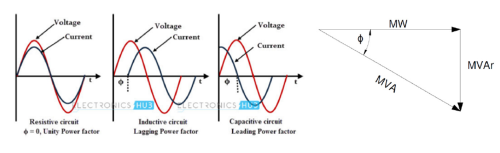 Alternating Current (AC) power generation aims to produce an alternating voltage in the shape of sine wave, whereby the current has a similar wave at the same frequency. However, the current may not be timed in phase with the voltage. AC power can have three types of load, depending on how it affects the timing of the current to the voltage: resistive, inductive & capacitive. For a purely resistive load, the current and voltage are co-incident. However, this is not the normal case. Electric loads and grids have both inductive and capacitive elements. Inductive elements want to maintain constant current flows, while capacitive ones want to store charge (voltage). Active power is measured in Watts. With AC being a cycle, there is another value orthogonal to it, called reactive power, measured in units of Volt Amps Reactance or VARs. The diagram below explains the relationship.
