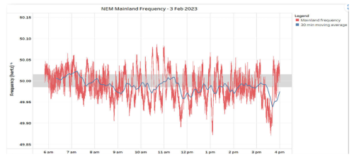 However in recent times, there have been significant and rapid swings in the Australian grid frequency between the control limits, shown in the graph below. The gray region is the deadband of allowable frequencies where no intervening measures need be taken by the grid operators. When outside the deadband region, generators are supposed to be offering primary frequency response support – for underfrequency (load is greater than generation), grid operators increase the generators’ output. This is either done automatically or by dispatching plant to increase load. From the rate of frequency decline, calculations indicate there could have been at least 600MW shortfall in generation over the five minute dispatch process. The cause of the variability observed hasn’t been positively identified, but is likely to be uncontrolled solar generation. If that is the case, then it indicates that faster acting and more expensive frequency control services are needed.