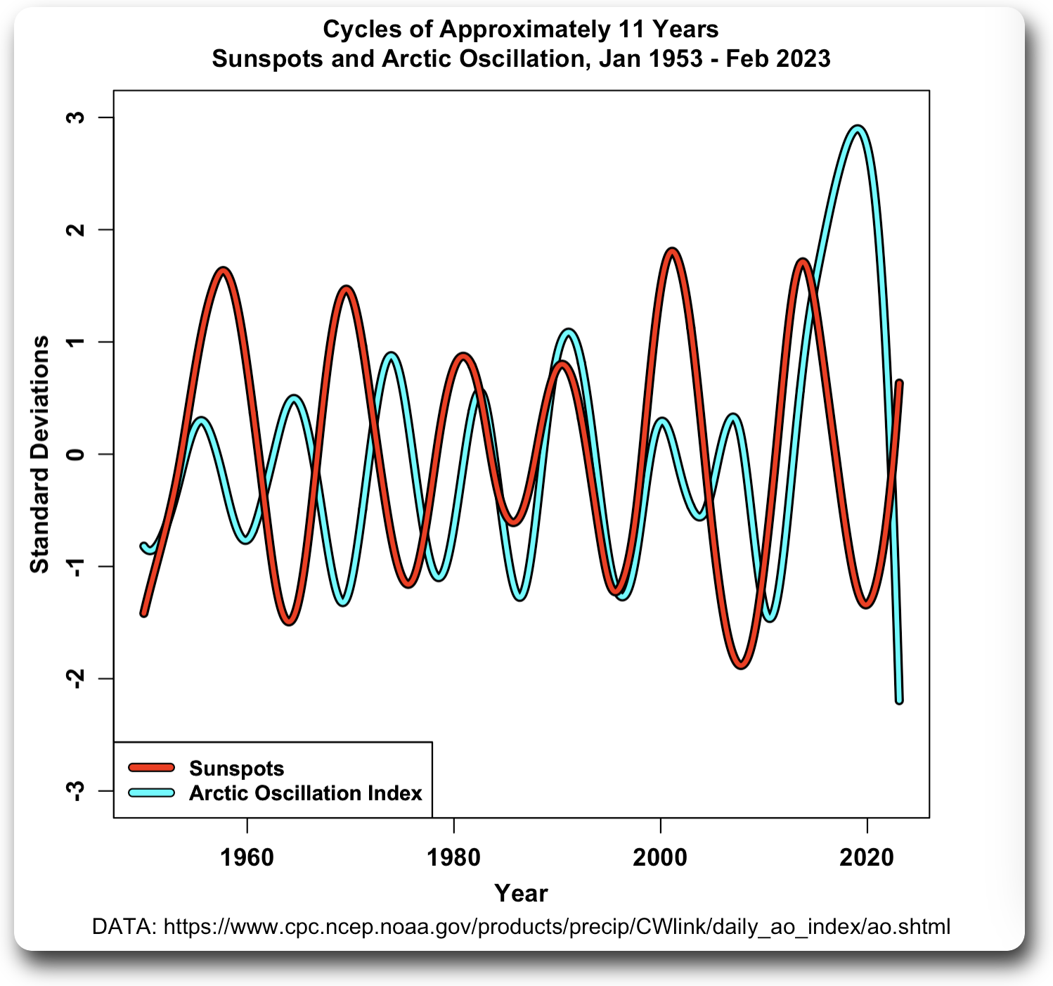 Since there is reasonably good agreement between the timing of the cycles of the three datasets, let me use their average to represent the long-term conditions in the tropical Pacific, and compare that to the sunspot data.