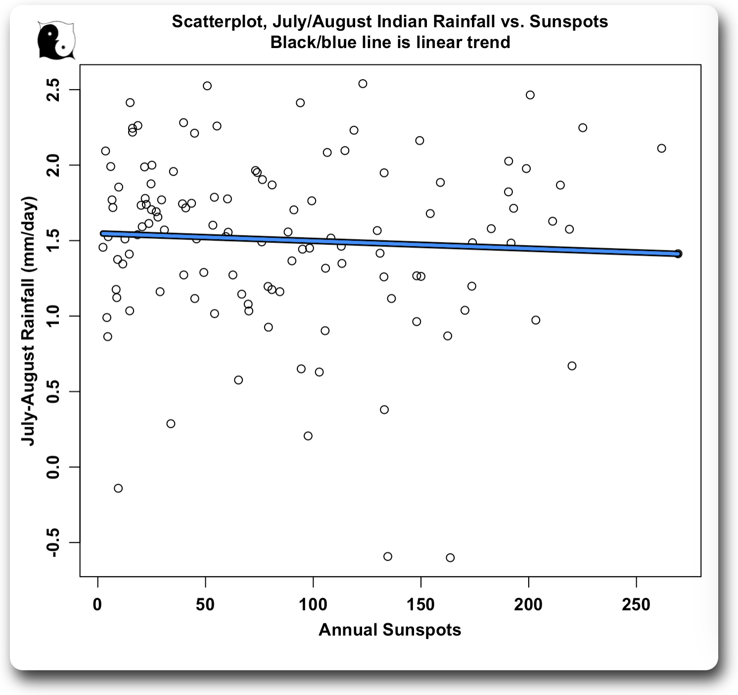 Next, here’s a scatterplot of sunspots vs. monsoon (July-August) Indian rainfall.