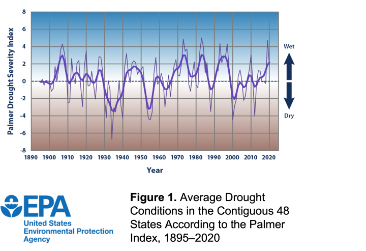 First, using the Palmer Drought everity Index, an EPA time series for the United States contiguous 48 states, shows absolutely no trend in droughts for the last 125 years. The worst drought conditions happened in the 1930s.