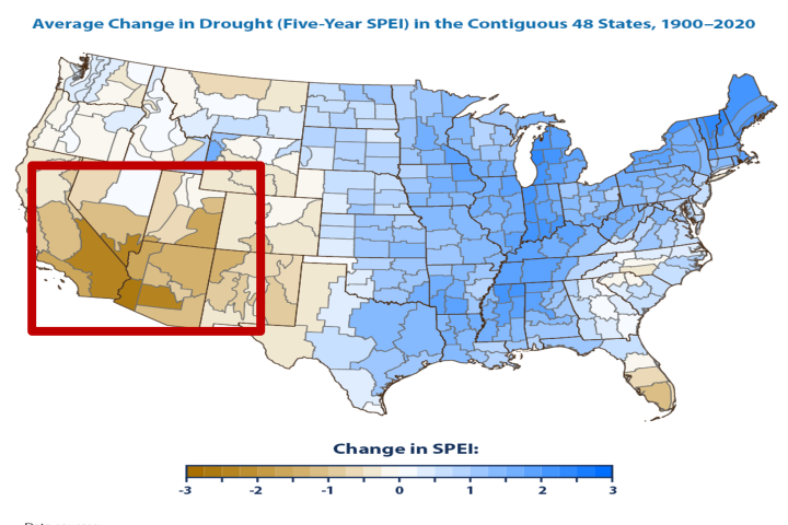 Looking at 100-year regional trends, there have been fewer droughts in the eastern half of the United States.