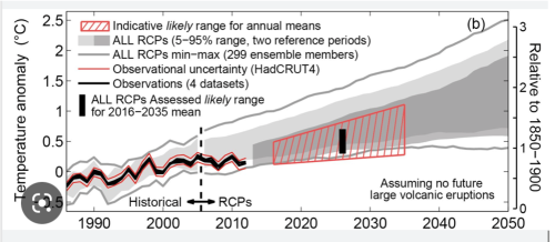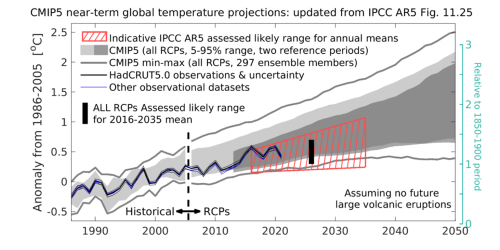 “Plausible scenarios of natural climate variability in the mid-21st century (not included in the climate model simulations) point to a slowdown in the rate of global warming driven by: an expected solar minimum, the possibility of explosive volcanic eruptions, and a projected shift in multi-decadal ocean circulation patterns.”