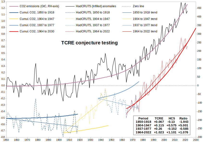 I should have “lined up” the “Cumulative CO2 emissions” scale (in GtC) with the temperature anomalies determined by “TCRE = 1.65” …