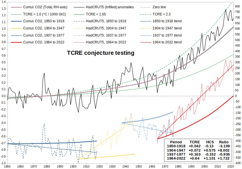 The only exception is the “current / recent warming period”, from 1964 to 2022, when the “other factors” added ~72% to the “expected” TCRE warming from (cumulative) CO2 emissions.