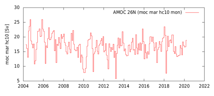 Figure: Observations of the AMOC 2004 to 2020 of “Rapid” at 26,5°N: Source.