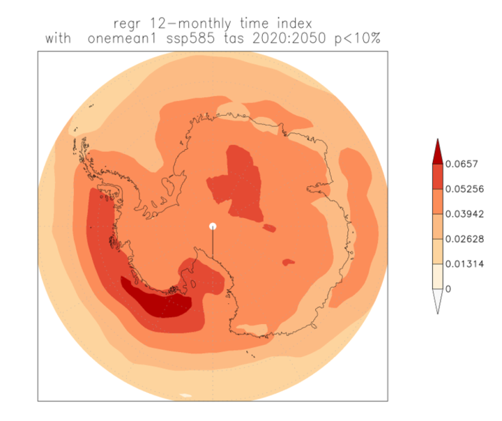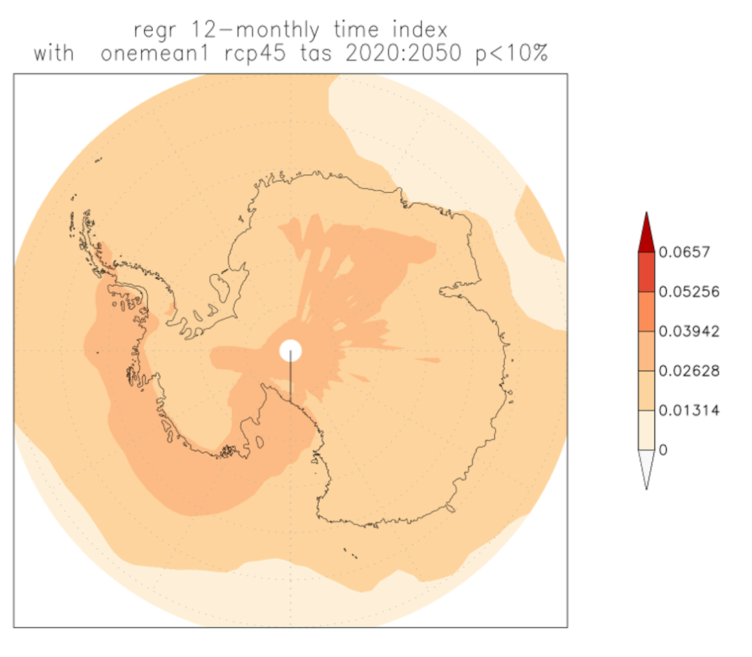 Fig.4: The linear temperature trends for RCP4.5 in and around Antarctica.