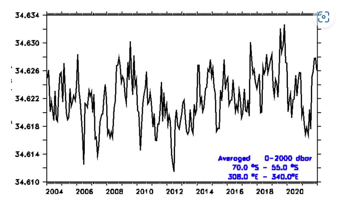 E23 moreover concluded that the ocean freshening due to melting near parts of the western Antarctic (namely Ross Sea and Weddell Sea) will lead to the described reduction of the AABW within 30 years to 2050. I had a look at the observational “Argo” data, provided by the “Marine Atlas”. Until December 2021 there is no trend in the salinity data, here shown for the average 0-2000 m depth in the Weddell Sea: