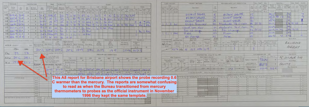 “As I understand it, the average difference was + 0.15 degrees in Brisbane and -0.34, -0.27 and -0.28 for different years in Mildura. So there doesn’t seem to be any evidence that the new thermometers give warmer results than the old thermometers – just different.” end quote