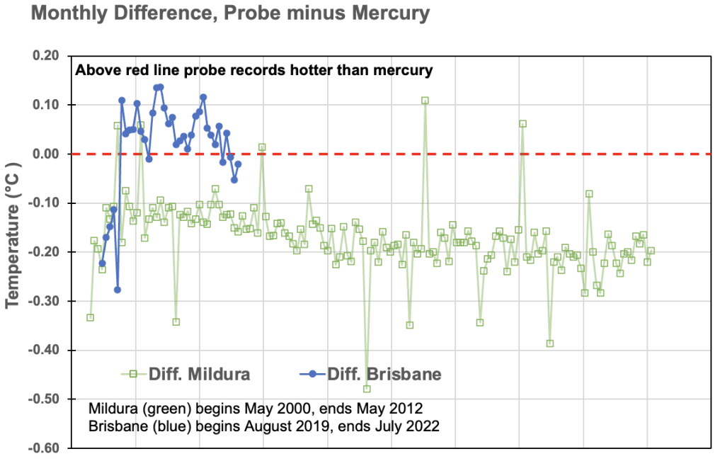 A similar pattern in the temperature difference between the probe minus the mercury was evident in the parallel data that I obtained for Mildura, as shown by the green series in Chart 2.